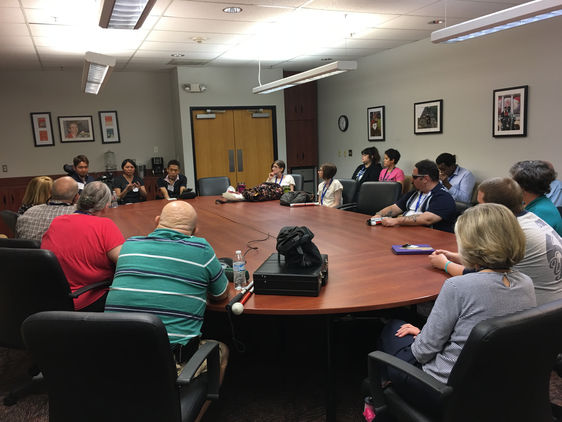 そして学校といえば8月2日にアリゾナ州のNPOの盲学校を見学させてもらいました。まず先生たちと1時間ほど話をさせてもらいました。ここでも「NCILカンファレンス」同様、白杖を持っている人はもちろん、日本に比べて盲導犬を連れてる人がたくさんいました。その中でアメリカの道や建物には点字ブロックがあまり多くないことについて尋ねると、「どこにでも点字ブロックがあるわけではないので、点字ブロックがなくても道を歩けるようにトレーニングをしている。」とのことで、実際に学校の中を壁や点字ブロックを頼らずに歩いている人が多くいました。日本とは考え方が違うな、アメリカ人はなんだかたくましいな~と思いました。逆に都会と田舎で街のバリアフリー化などに大きな差があるという問題点は日本と同じでした。その後校内を見学させてもらいました。この学校には小さい子供から大人まで幅広い年代の人が通っていて、この学校から普通学校に進学する生徒もいるそうです。